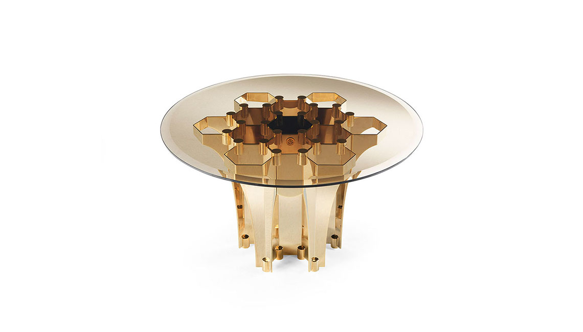 SOHO茶幾,透明的茶幾臺面露出了如蜂巢一般燦金的茶幾腳,