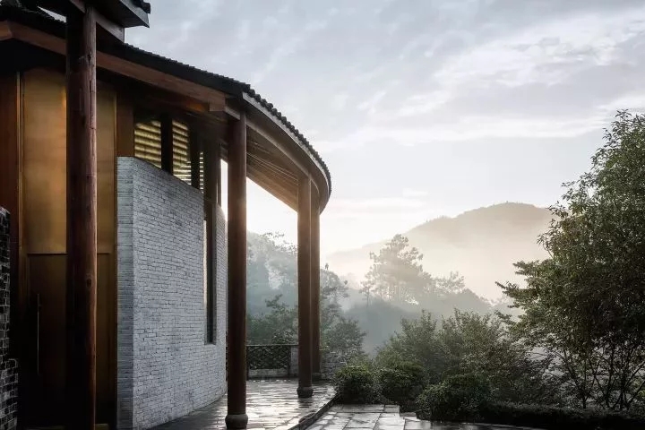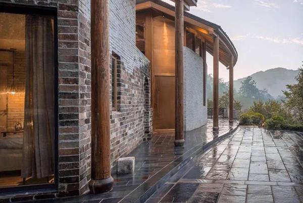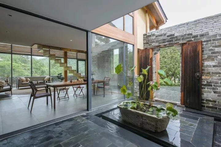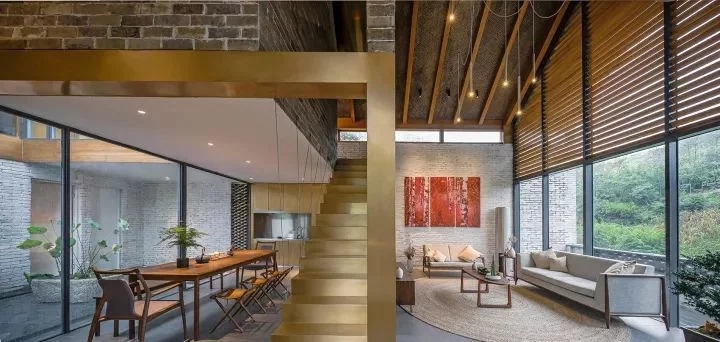 傳統磚瓦,木梁等材料與銅門,落地玻璃窗門的設計形成鮮明對比,現代工藝與傳統剪紙之間的融合貫通。