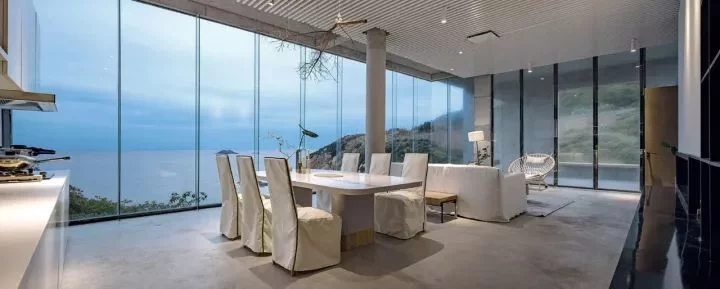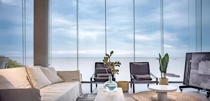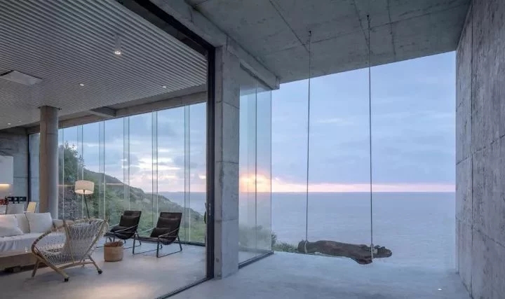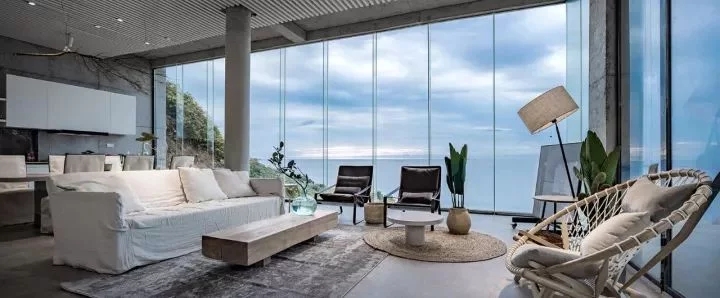 用玻璃墻,構造了一個270°的海景房,內部的家具選擇,設計師也偏向與類似戶外的沙發座椅,旨在與一望無際的海景相結合。