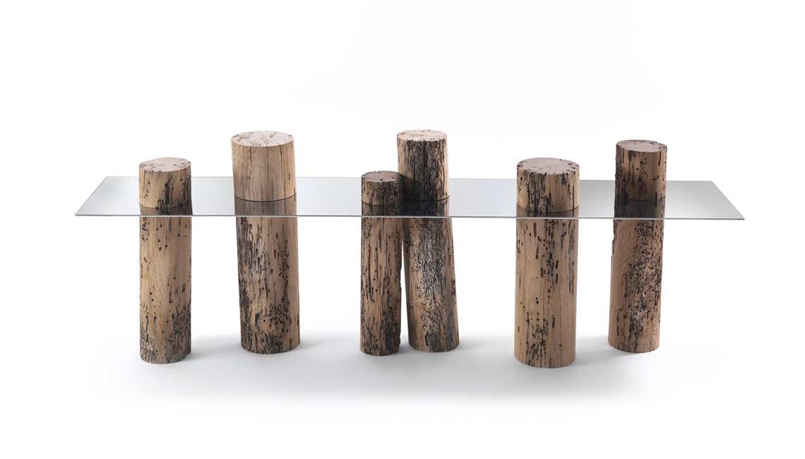 這是Riva1920用威尼斯橡木制作的具有標志性的餐桌,它模仿木材一半淹沒于水中一半呈現在水面的景象,利用原始木料,設計了這一款與眾不同的餐桌。