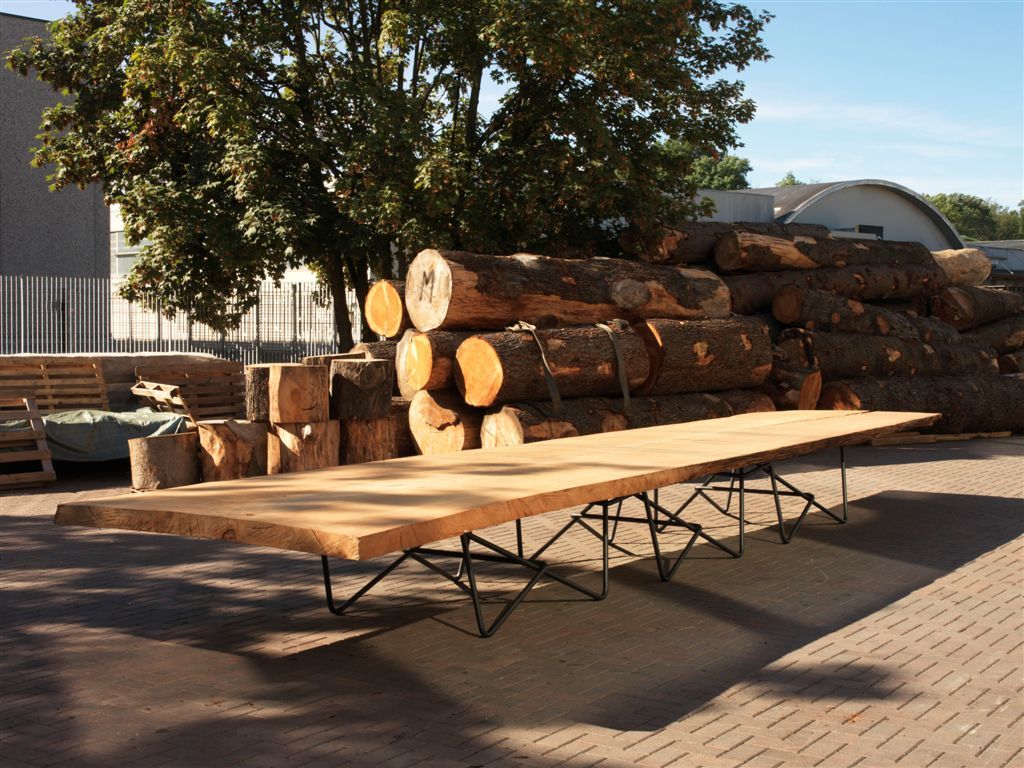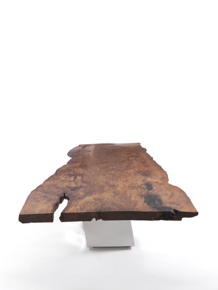 餐桌桌面由新西蘭古老的木材——貝殼杉木制成,國際著名的藝術家赫利登·希沙克在設計這款餐桌時,將鍛造的鋼片作為餐桌的底柱,這是自然產物與人工材料的結合。