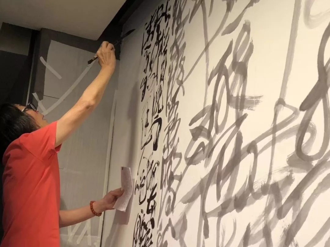 圖中正在為墻壁題字的正是王冬齡老師,作為著名書(shū)法家、中國(guó)美術(shù)學(xué)院教授、中國(guó)書(shū)協(xié)理事、浙江省書(shū)協(xié)副主席、中國(guó)書(shū)法進(jìn)修學(xué)院副院長(zhǎng),他的巨幅狂草,已經(jīng)超越了書(shū)齋的極限,筆墨完全被精神化,精神從具體的書(shū)寫(xiě)中抽象出來(lái),它們帶來(lái)的視覺(jué)體驗(yàn),更是一種情境,一種情懷。