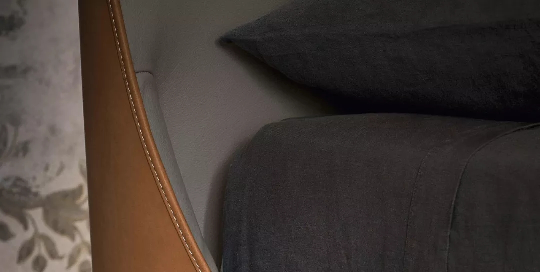 床架是一個與眾不同的結構:使用松木板和中密度纖維板構成縱向支撐結構,底部豎板則用多層白楊木,床腳是用鐵刀木色的白蠟木,這兩種材料的結合,在巧奪天工的頂級縫合工藝和對比車線的映襯下更光彩奪目。