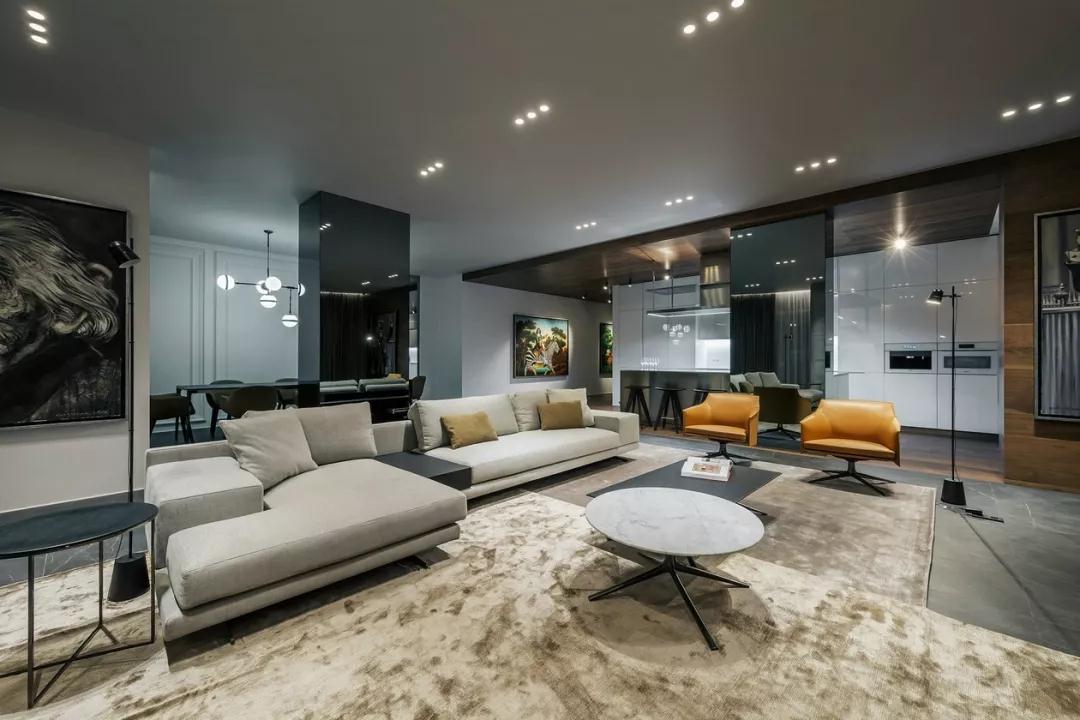 高級灰質感的沙發,迎合整體裝修風格,橘黃的扶手椅,點綴色彩,讓家變得精致又有格調。