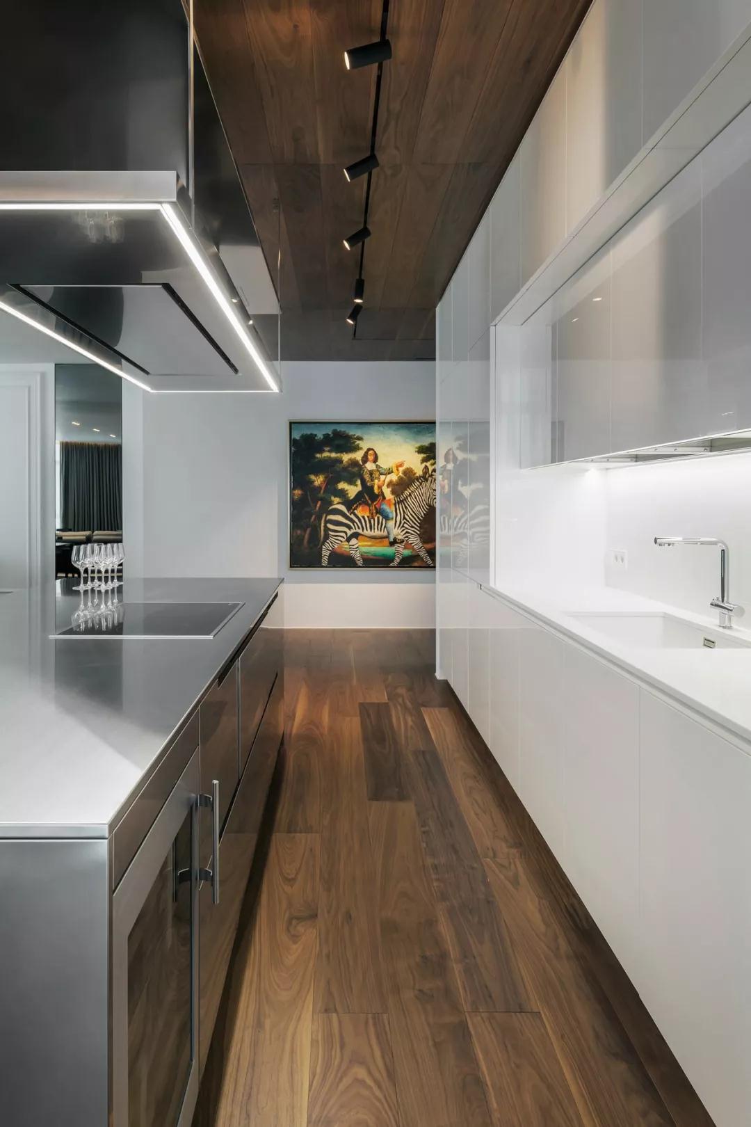 廚房空間中,整面的白色漆面收納墻不僅將冰箱隱藏于其中,同時也將其他電器雜物收拾得一干二凈,甚至連抽油煙機也是隱藏式的,空間中連煙道都完全看不到。