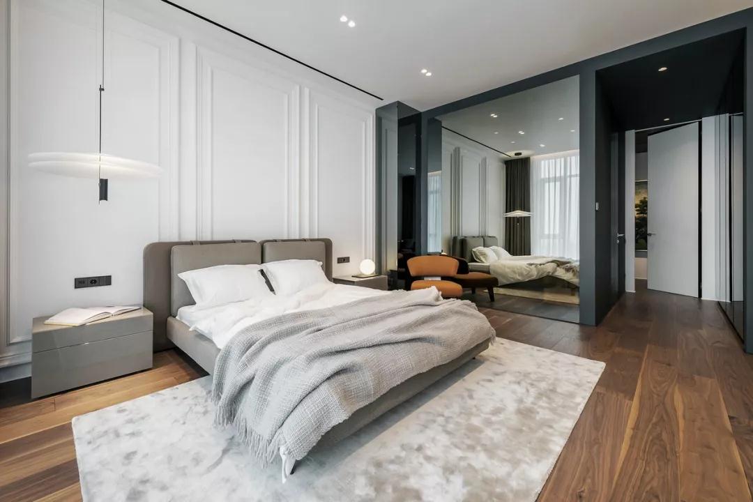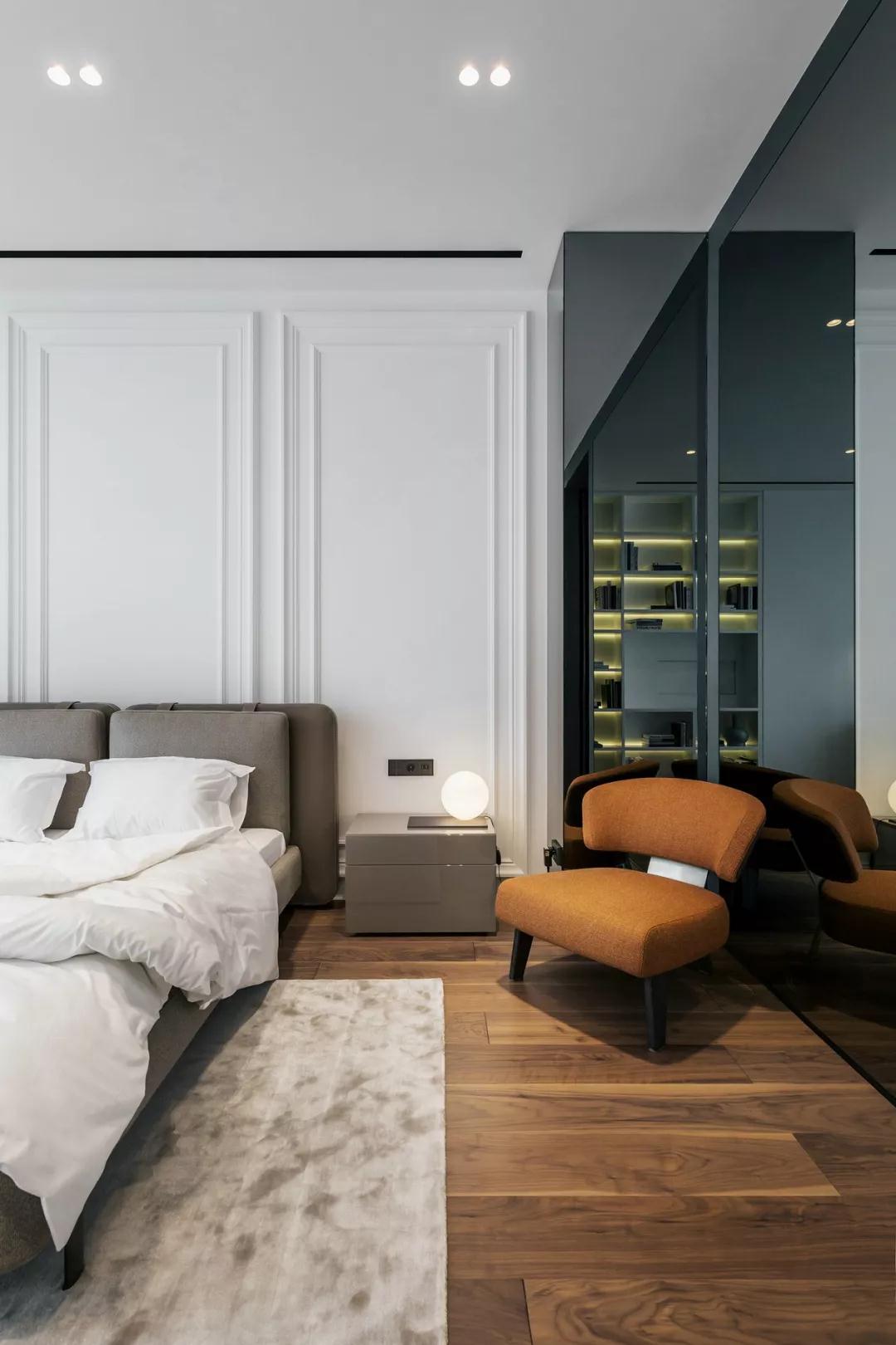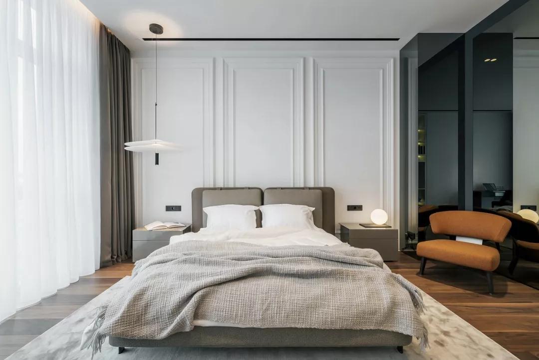 承接客廳的家具配色,同樣高級灰色的床體,讓通透的空間變得更加亮眼,亮色的椅子使干凈的格局多一點視覺上的沖擊。