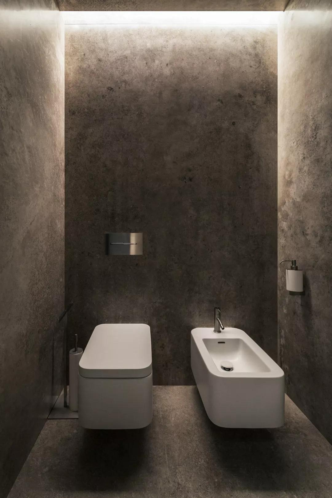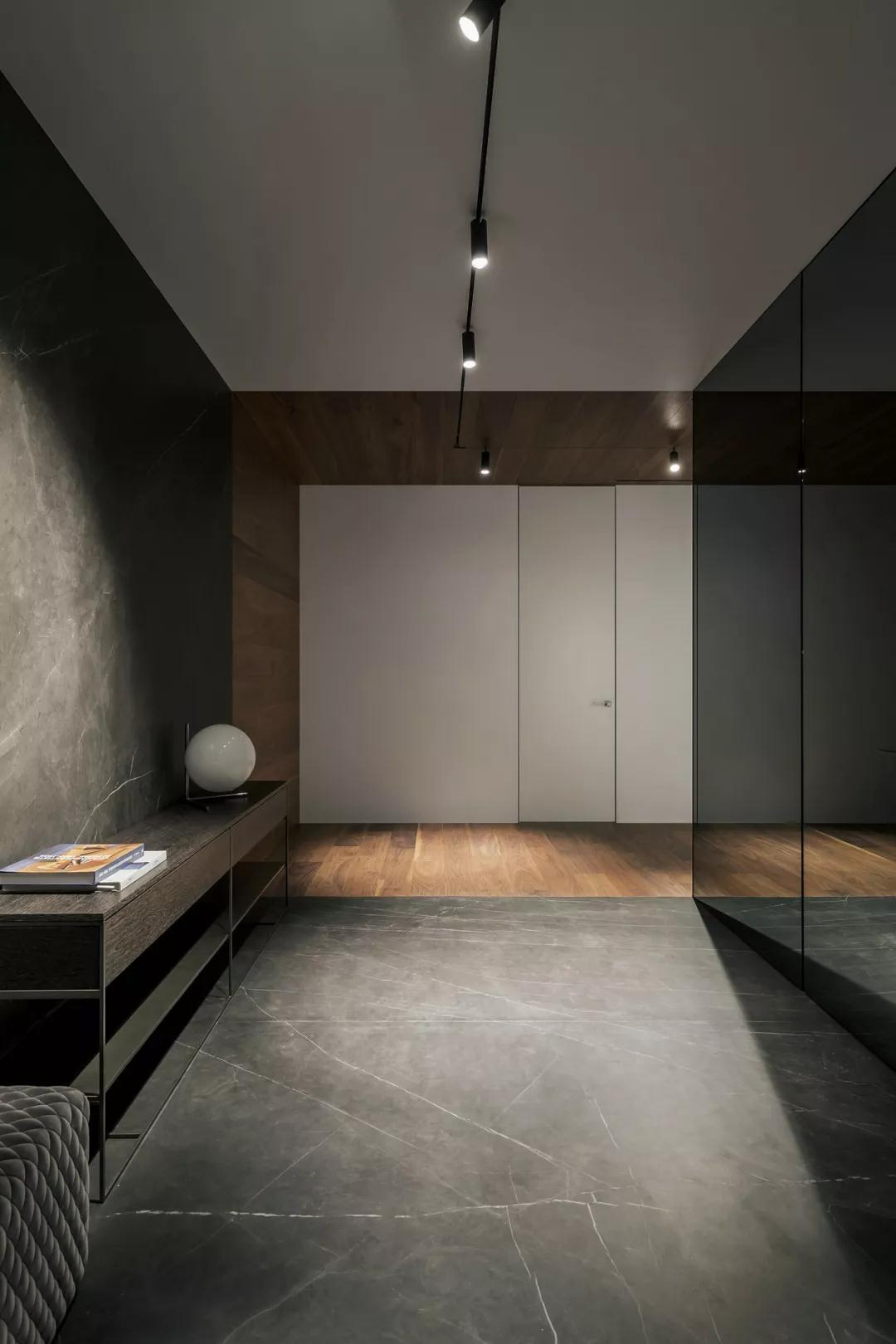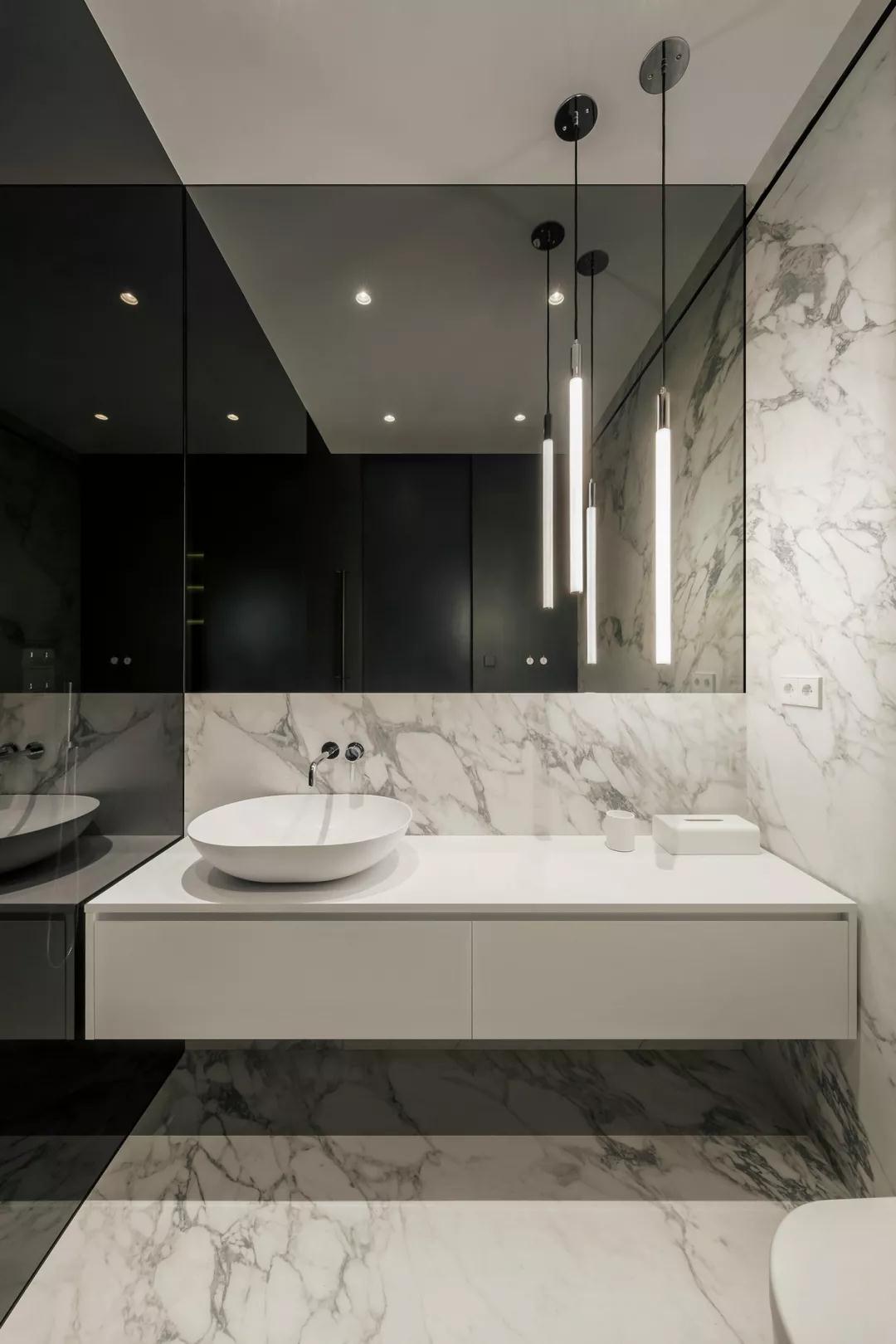 用黑白灰配色營造出來的高級之感,似乎是亙古不變的道理,黑色有紋理的大理石地面連接白色紋理大理石墻壁,就連衛生間都那么高級。