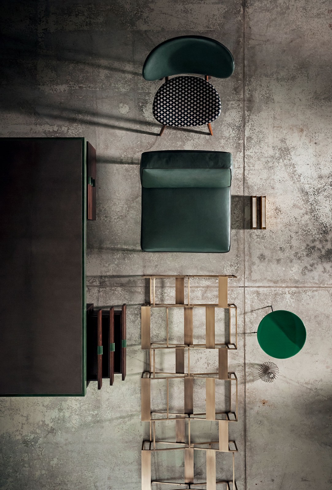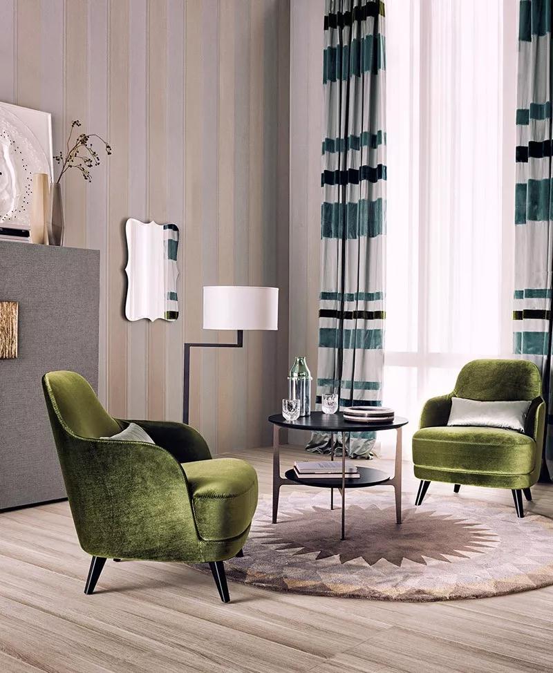 Baxter的這兩款抹茶色椅子與灰色的空間進行搭配,彰顯了復古的氣氛。色彩比皮具的融合,散發了低調的高級感。