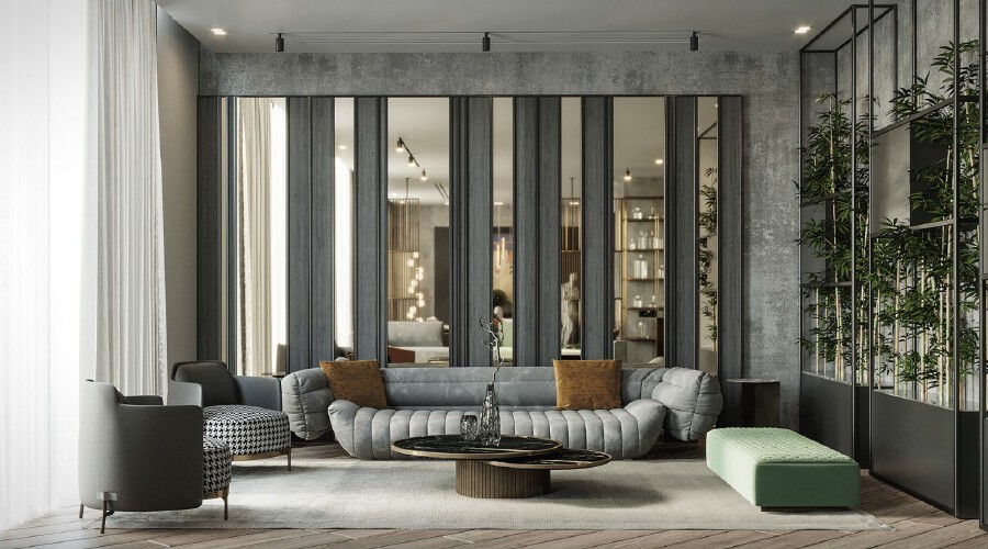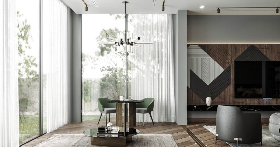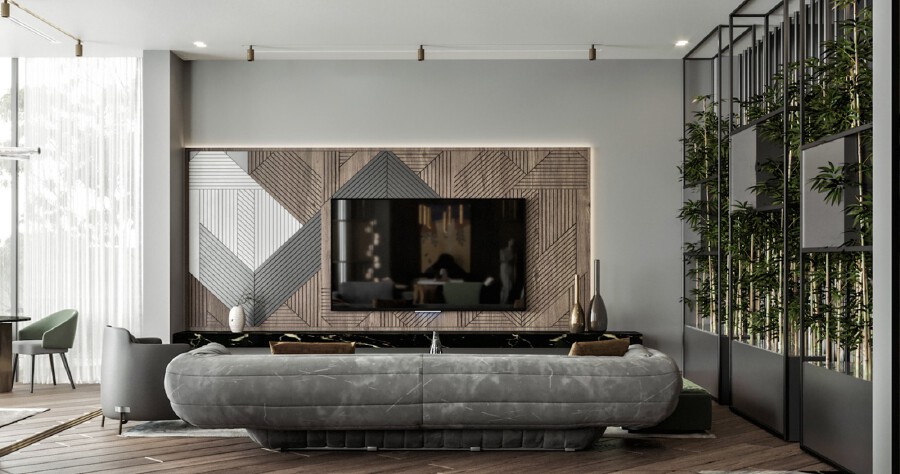 客廳區域被細致地劃分為:會客區、觀影區以及陽臺休息區。會客區的顏色主要用到了灰色、豆蔻青與肉桂色。這三種飽和度低的治愈系顏色搭配在一起,和諧又溫暖。