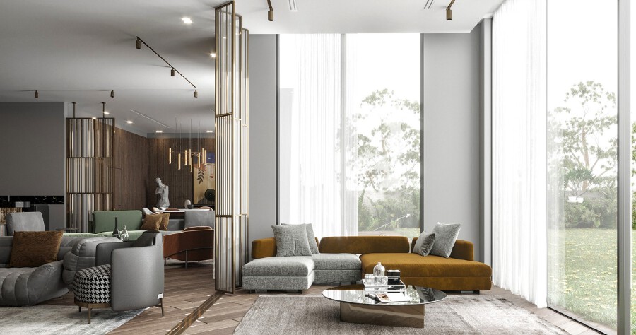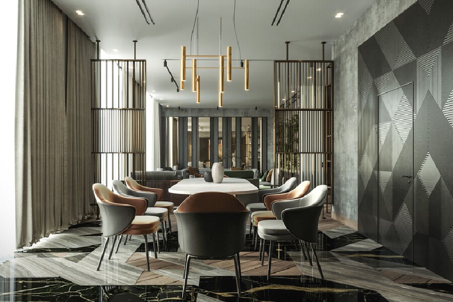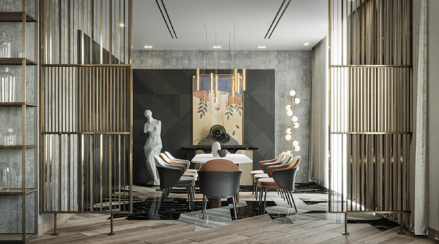 用金屬隔檔將客廳與餐椅隔離開來,形成兩個獨立的空間。餐廳的用色以灰色和黑色為主,用MINOTTI肉桂色的Angie Dining餐桌作為跳色,中和了深色的沉悶感,用餐的氛圍更加融洽。