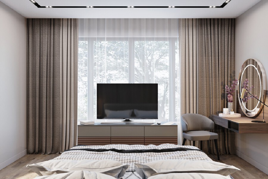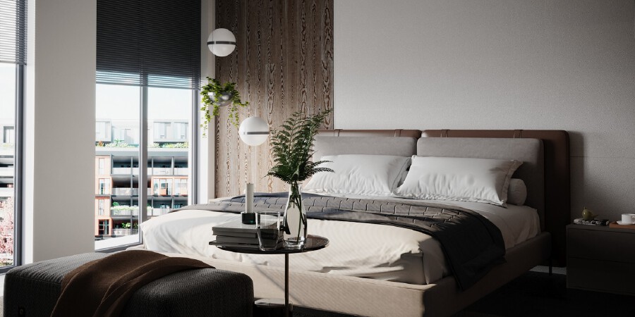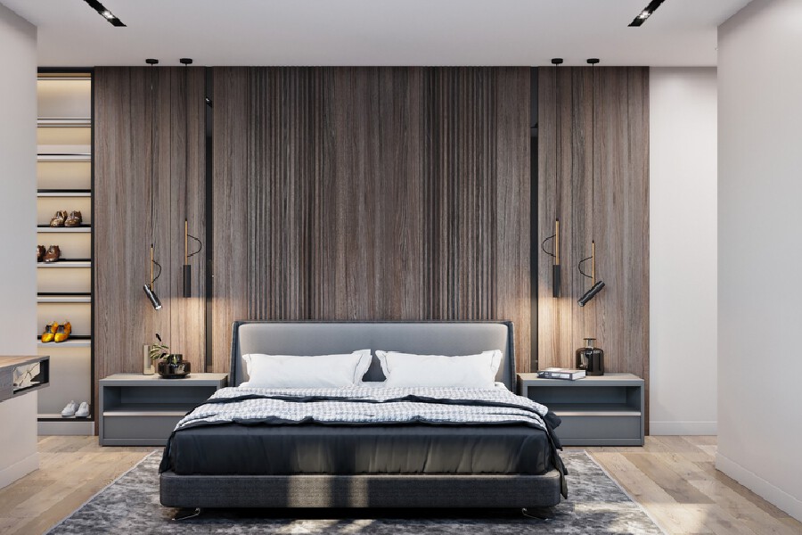 主臥室設計以原木色調為主,沒有華麗的點綴卻有種低調的高級感。燈帶代替主燈,房間看起來更加的簡潔干練。底座較低的MINOTTI SPENCER床和床頭吊燈的形成視覺落差,延伸了層高。