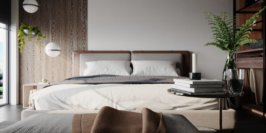 次臥的配色延續了主臥的木棕色,綠植的點綴增加了生活的氣息。