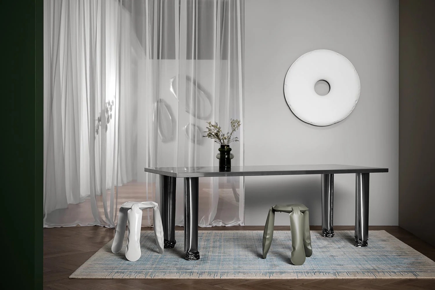 The PLOPP stool is an original, iconic object made in FiDU. It is a flagship of Zieta Studio and a symbol of Oskar Zi?ta’s research into the properties and possibilities of metal. The “Polish Air-Pumped Folk Object” proves how the artistic aspects of the design can be summarized in highly advanced engineering forms. Winner of the Red Dot Design Award 2008, the German Design Council Award 2008, and the Forum AID Award 2009. PLOPP is a manifesto of the FiDU technology and the “controlled loss of control” process. Two ultra-thin steel sheets are welded together around their edges and inflated under high pressure, deforming a 2.5D flat form into a 3D object.